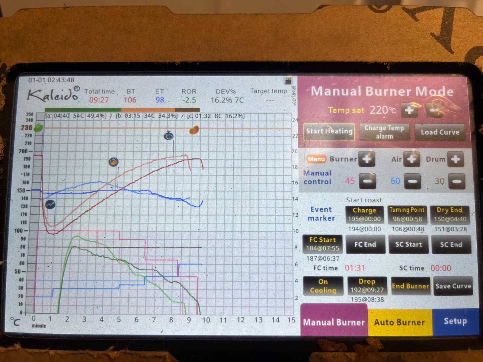 El gráfico de nuestro tostador (que has insertado) es la representación visual de un perfil de tueste. Aunque parece complejo, refleja el control meticuloso que aplicamos en nuestra tostaduría. Sus líneas y puntos son cruciales: